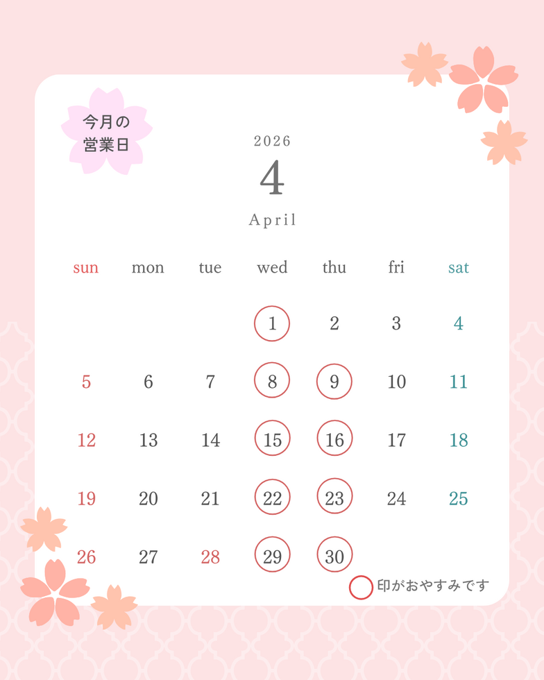 カレンダーの◯印がついている日がお休みとなりますので、ご確認いただけますと幸いです。